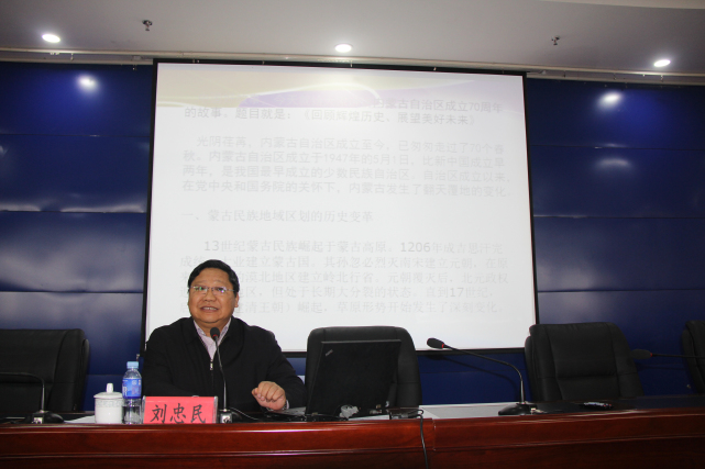 报告会上,刘忠民团长围绕内蒙古基本区情和我国的经济发展形势,阐述了内蒙古70年不平凡的成长历程和70年来所取得的伟大光辉成就,对我国2017年经济发展趋势,尤其是内蒙古目前发展的大好形势进行了深刻地讲解,使在座师生准确把握、客观认识了我国经济发展的新情况新变化,全面了解了内蒙古所处的发展阶段和打造祖国北疆亮丽风景线面临的形势任务,对内蒙古的未来发展充满希望和信心。